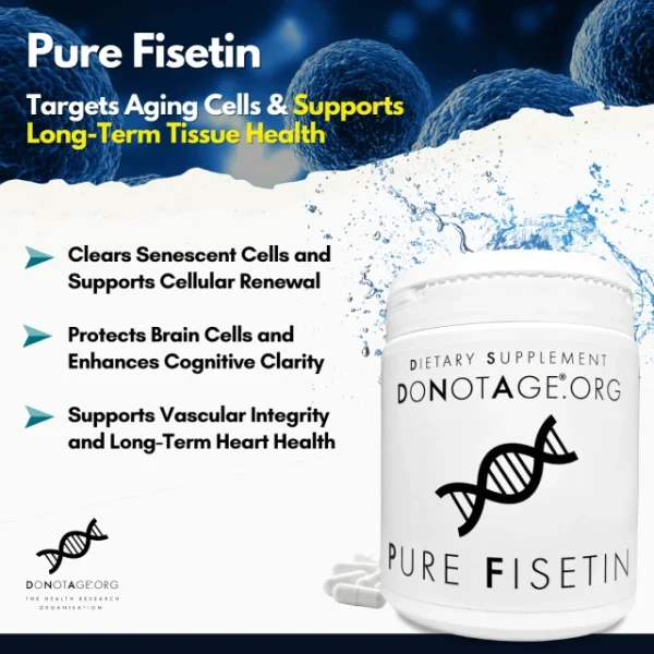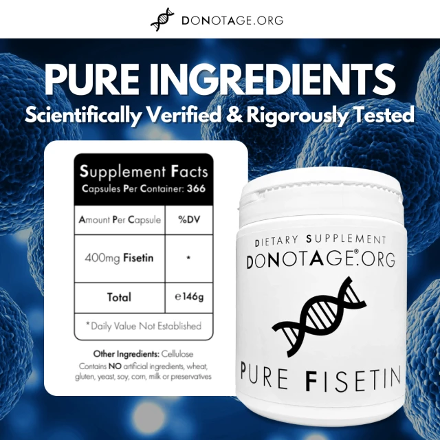 Many Fisetin products are unstable, underdosed, or diluted with fillers. Pure Fisetin from DoNotAge.org is developed specifically for researchers, ensuring unmatched purity, consistent dosing, and stability. This is the same ingredient used in trials exploring Fisetin’s effects on aging and cognition.