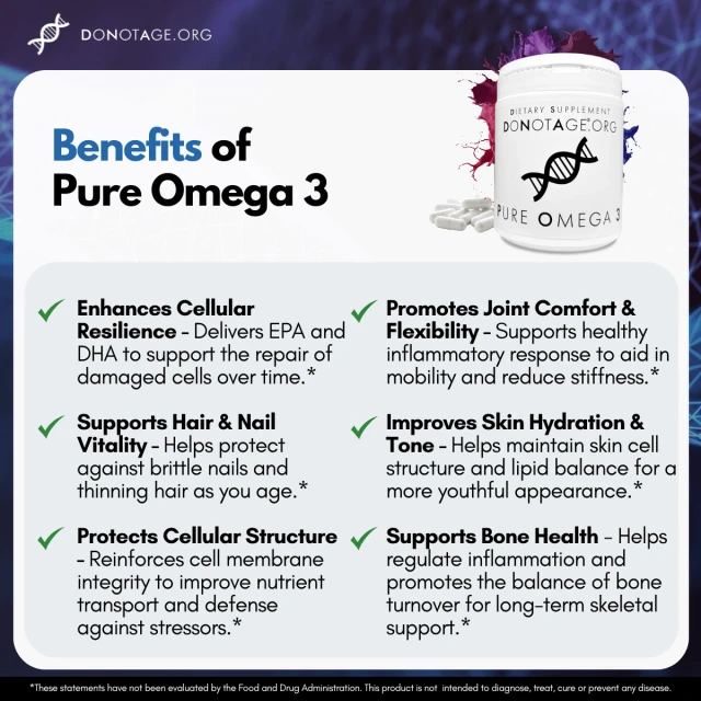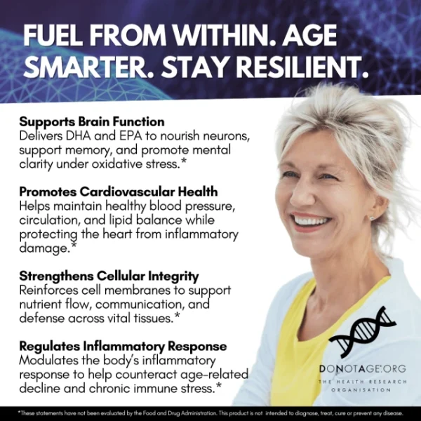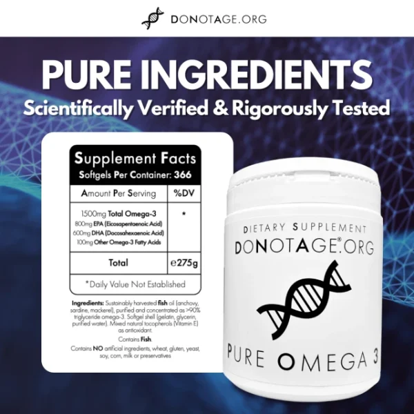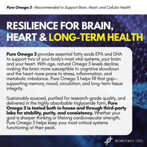 At DoNotAge.org, we don’t just follow health science, we help lead it. Pure Omega 3 is formulated with high-purity EPA and DHA, delivered in their natural triglyceride form for superior bioavailability and absorption. Unlike standard Omega 3 supplements that use synthetic ethyl esters or lower-grade fish oils, our softgels contain ultra-purified, sustainably sourced marine lipids designed to meet research standards.