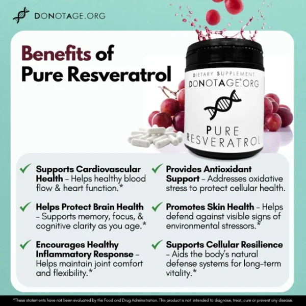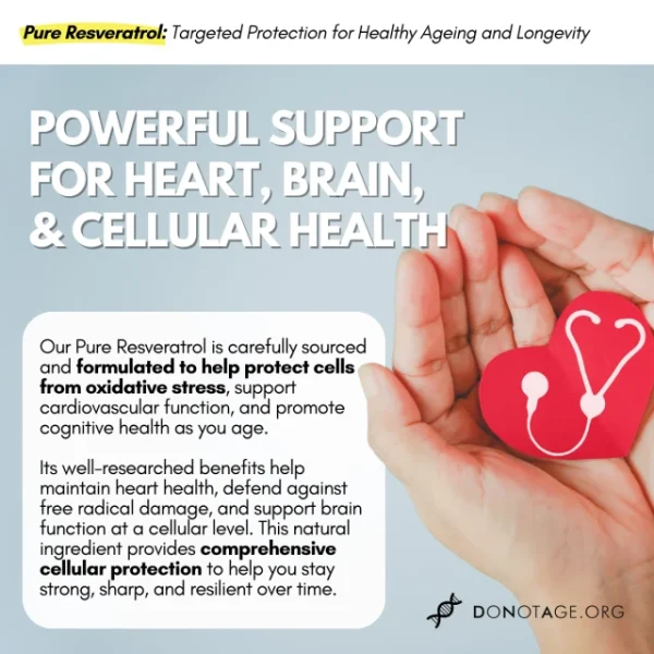 At DoNotAge.org, we believe healthy aging starts at the cellular level. Pure Resveratrol is carefully sourced and rigorously tested to support heart health, cognitive function, and overall resilience as you age. Unlike many trans-resveratrol supplements on the market, we ensure the highest purity and bioavailability without unnecessary additives or fillers through in-house testing.