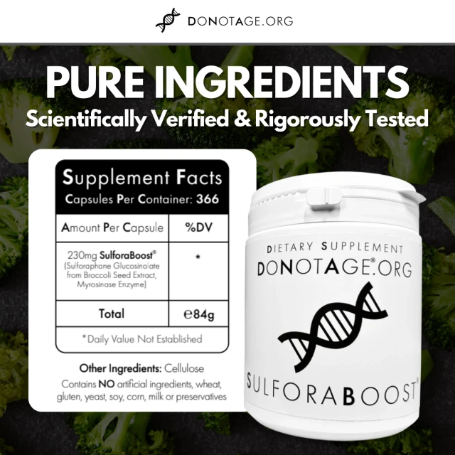At DoNotAge.org, we lead the research so you can take charge of your health. SulforaBoost® is a research-leading formula, developed with purity, stability, and bioactivation in mind. Every batch is rigorously tested and contains active myrosinase ensuring your body gets the real, effective sulforaphane that researchers around the world depend on.